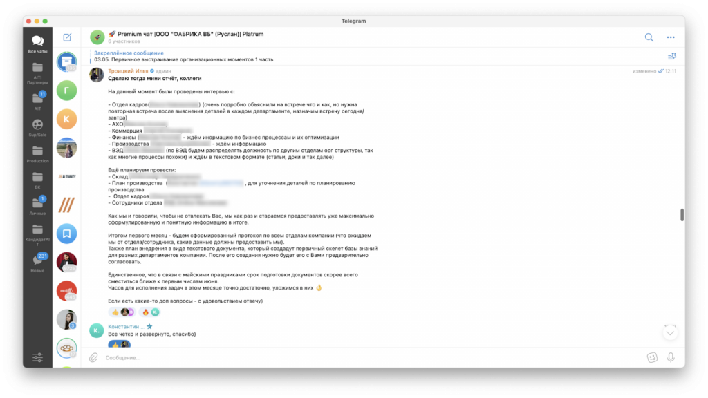 Работа предстояла масштабная и кропотливая, поэтому была создана группа в мессенджере, где прописывались планы и отчеты по проделанной работе, а также оперативно держалась связь со всеми ключевыми сотрудниками.